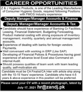 Latest Z and J Hygienic Products Pvt Ltd Accounting Posts Lahore 2025