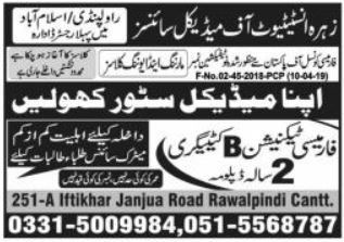 Zahra Institute of Medical Sciences has announced admissions 2023 for B Pharmacy. Eligible students can apply for academic admissions 2023 in Zahra Institute of Medical Sciences Rawalpindi Punjab Pakistan for Medical Medical College. Students for admissions in B Pharmacy & criteria can apply as per Private institute admission policy 2023 before closing date December 5, 2023 as per advertisement. Read newspaper ad for exact details.