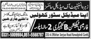 Zahra Institute of Medical Sciences B Pharmacy, Pharmacy Technician admissions 2023 has been announced. Students who want to take admissions in Zahra Institute of Medical Sciences Rawalpindi Punjab Pakistan for academic year 2023 to continue education in Medical Medical College can apply. Eligible students for fulfilling criteria for admissions in B Pharmacy can enroll as per Private admission policy 2023 till closing date 11 December 2023. Read newspaper ad for exact details.