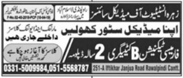 Zahra Institute of Medical Sciences Pharmacy Technician admissions 2023 has been announced. Eligible students can apply for academic admissions 2023 in Zahra Institute of Medical Sciences Rawalpindi Punjab Pakistan for Medical Diploma. Students who want to enroll for academic session 2023 in Diploma qualification and admission criteria for Private institute can apply till last date 7 June 2023. Read newspaper ad for exact details.