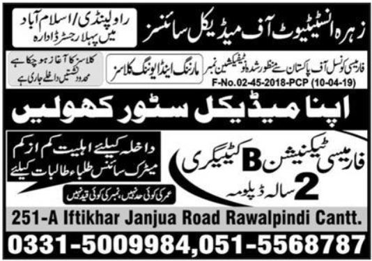 Admissions in Zahra Institute of Medical Sciences 2024 for Pharmacy Technician has been announced. Zahra Institute of Medical Sciences Rawalpindi Punjab Pakistan welcomes students to apply for admissions in academic year 2024 in Medical Medical College. Eligible candidates for admissions in B Pharmacy and Diploma can apply as per Private institute criteria and before closing date 10 September 2024 after reading advertisement online. Read newspaper ad for exact details.