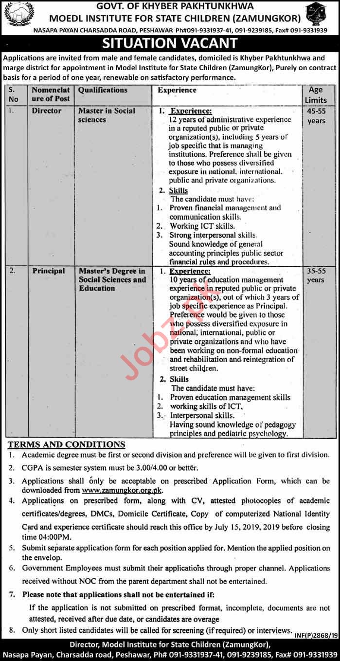 Latest Zamung Kor Model Institute of State Children Management Posts Peshawar 2025