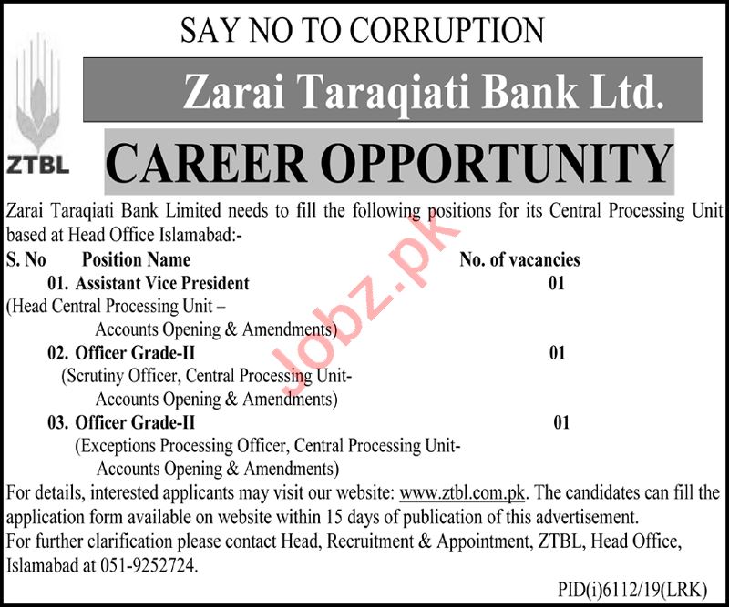 Vacancies in Zarai Taraqiati Bank Limited ZTBL Advertisement May 2020