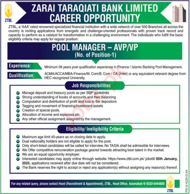 Zarai Taraqiati Bank Limited ZTBL invites applications for job positions advertised in daily Jang dated 22 December 2024 for following vacancies in Islamabad, islamabad Islamabad Pakistan.