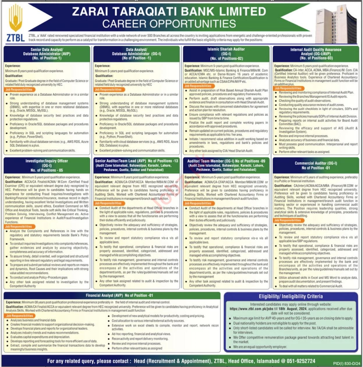 Zarai Taraqiati Bank Limited ZTBL jobs advertisement dated about 4 August 2024 in daily Jang Newspaper invites application for the vacant post of Islamic Shariah Auditor, Team Lead Avp, Data Analyst, Database Administrator, Investigator, Inquiry Officer, Financial Analyst, Commercial Auditor, Internal Audit Quality Assurance Analyst, Team Member and Auditor in Islamabad, islamabad Islamabad Pakistan. Educational qualifications required Bachelor, Master, MS and MBA etc.