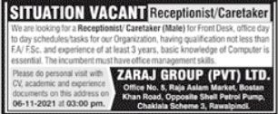 Vacancies in Zaraj Group Pvt Limited Advertisement November 2021
