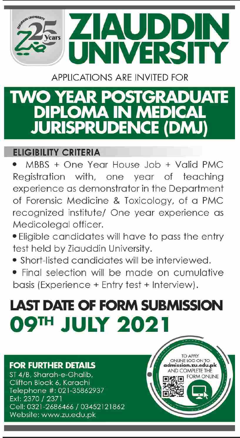 Ziauddin University is a private sector university has announced admissions for Two Year Postgraduate Diploma in Medical Jurisprudence DMJ in Karachi Sindh Pakistan 2021. Read newspaper ad for exact details.