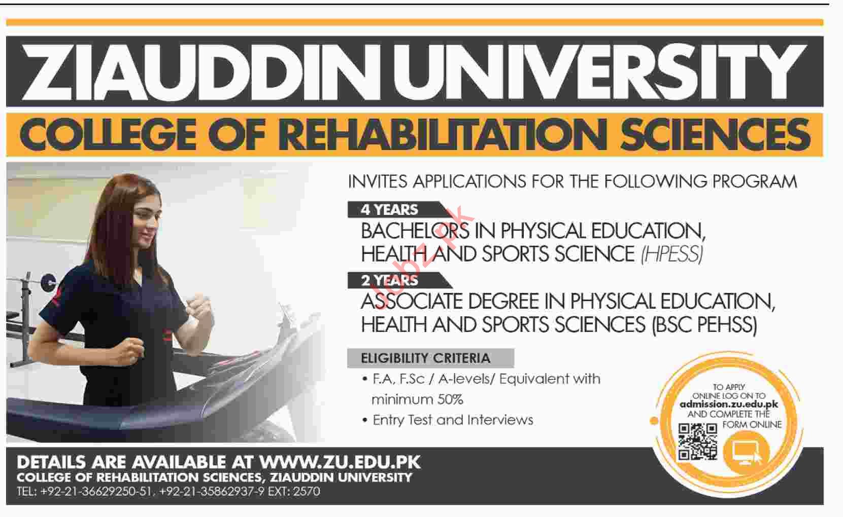 Ziauddin University College of Rehabilitation Sciences has Announced admissions for the degree of bachelor in Physical Education Health & Sports Sciences Karachi. Read newspaper ad for exact details.