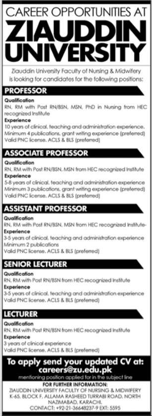 Ziauddin University is looking for candidates for following posts as per job advertisement published in daily Jang Newspaper of February 20, 2022 for location Karachi, karachi Sindh Pakistan: