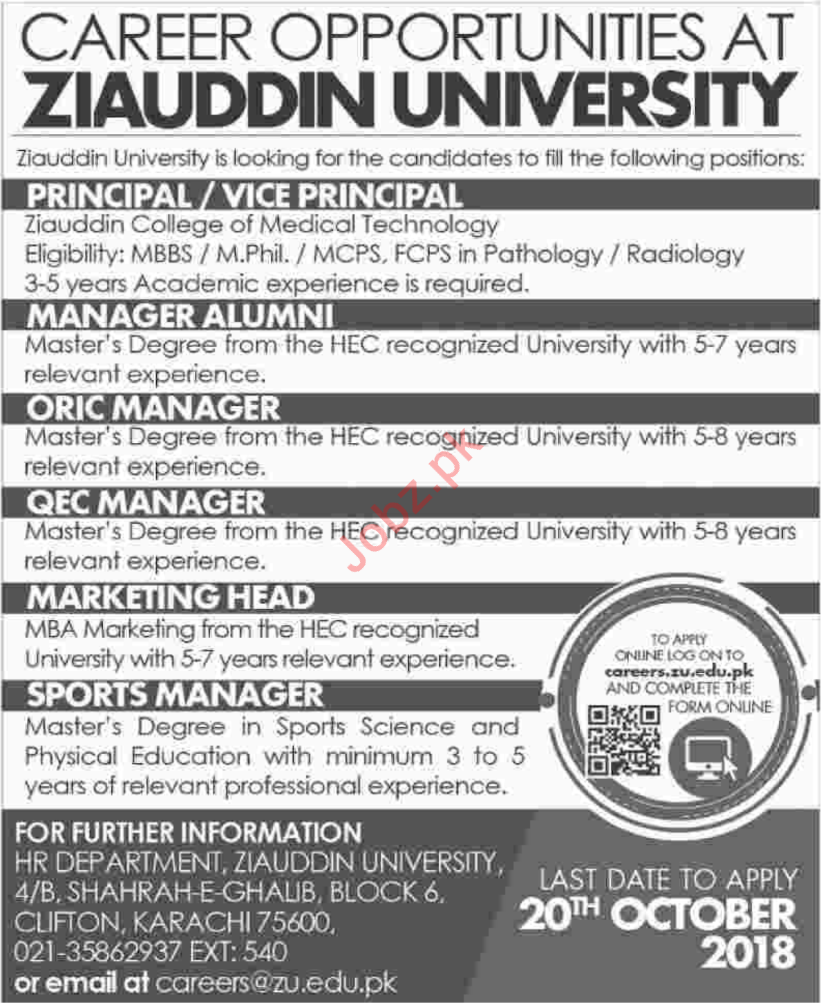 Vacancies in Ziauddin University Advertisement October 2018