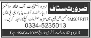 Zohra Institute of Health Sciences invites applications for job positions advertised in daily Jang dated 15 April 2025 for following vacancies in Rawalpindi, rawalpindi Punjab Pakistan.