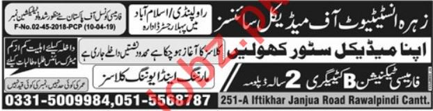 Zohra Institute of Medical Sciences has announced Admissions for Pharmacy Technician in Islamabad and Rawalpindi. Interested Student submit their admissions form before last date. Read newspaper ad for exact details.
