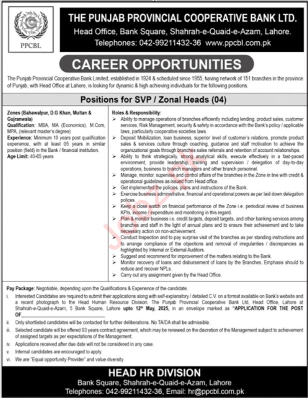 The Punjab Provincial Cooperative Bank Ltd PPCBL jobs advertisement dated about 27 April 2025 in daily Jang Newspaper invites application for the vacant post of svp zonal head in Gujranwala, dera ghazi khan, multan, gujranwala and bahawalpur Punjab Pakistan. Preferred Education is Bachelor and Master etc.