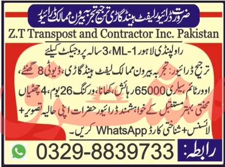 Latest ZT Transporter & Contractor Driving Posts Rawalpindi 2025