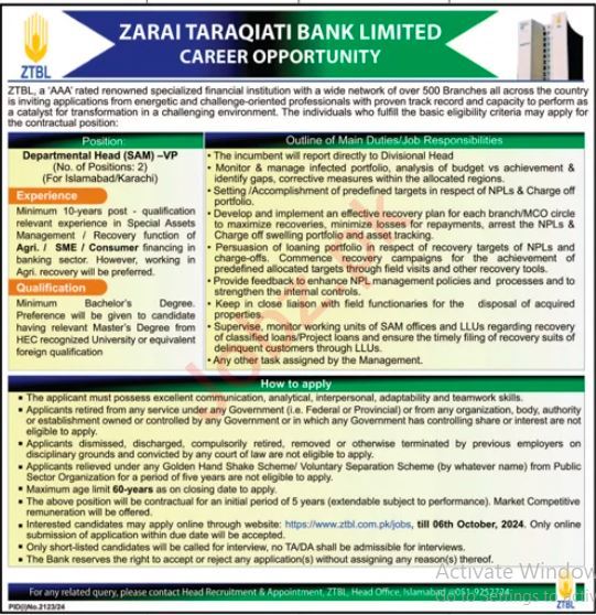 Latest Government jobs in Zarai Taraqiati Bank Limited ZTBL in Bank and others can be applied till 6 October 2024 or as per closing date in newspaper ad. Read complete ad online to know how to apply on latest Zarai Taraqiati Bank Limited ZTBL job opportunities.