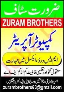 Zuram Brothers Faisalabad, faisalabad Punjab Pakistan invites applications from eligible candidates for the post of computer operator as per advertisement of April 22, 2024 published in daily Express Newspaper. Educational qualifications required Intermediate etc.
